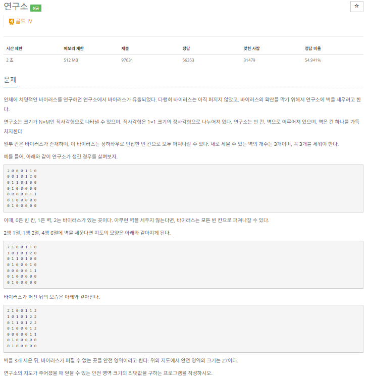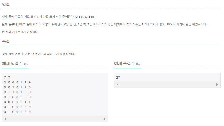 우선 조합으로 세 벽을 정한다. 그 후 바이러스를 2에서부터 퍼뜨린다(bfs). 다시 전부 돌며 0을 세고, 이를 반복하여 가장 max일 때를 출력한다.