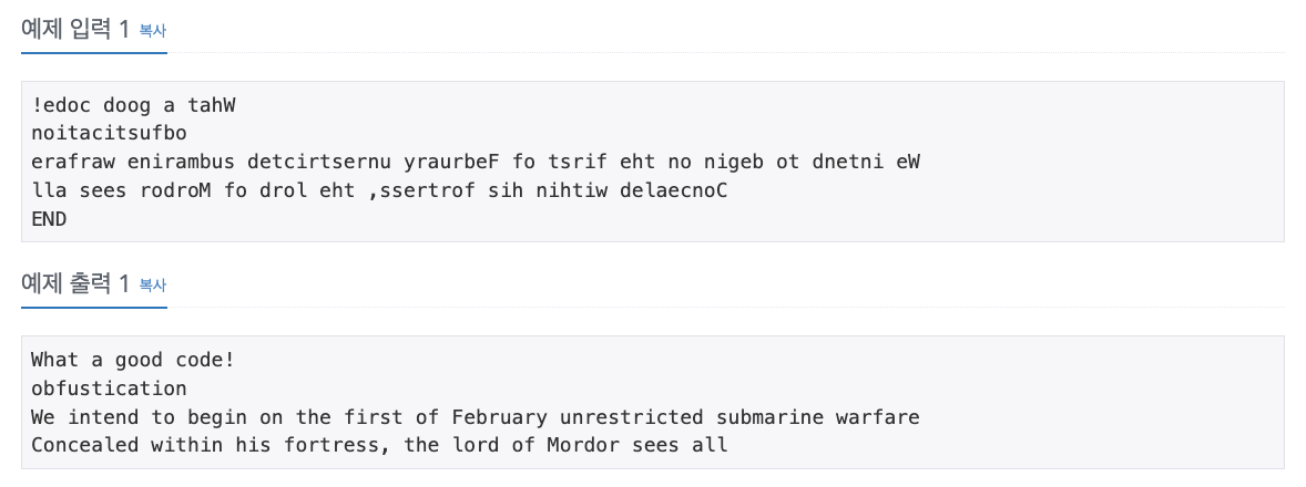 당신은 길을 가다가 이상한 쪽지를 발견했다. 그 쪽지에는 암호가 적혀 있었는데, 똑똑한 당신은 암호가 뒤집으면 해독된다는 것을 발견했다.이 암호를 해독하는 프로그램을 작성하시오.