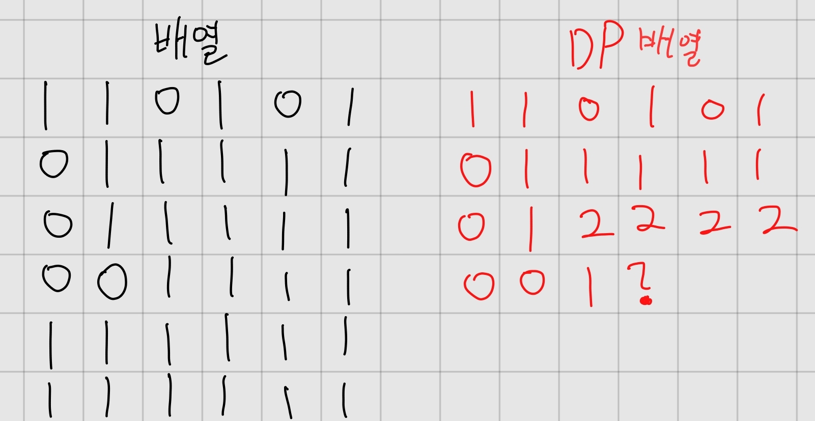 이때 dp[i][j]는 dp[i - 1][j] => (내 바로 위 쪽에서 있을 수 있는 최대 정사각형 크기)