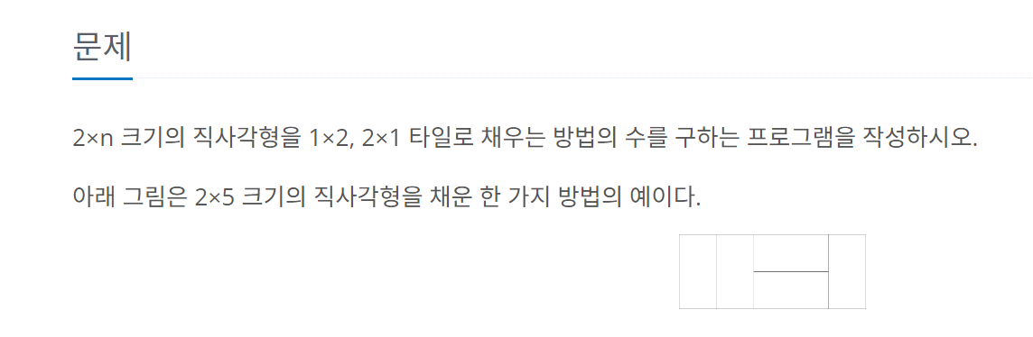 2×n 크기의 직사각형을 1×2, 2×1 타일로 채우는 방법의 수를 구하는 프로그램을 작성하시오. 아래 그림은 2×5 크기의 직사각형을 채운 한 가지 방법의 예이다.