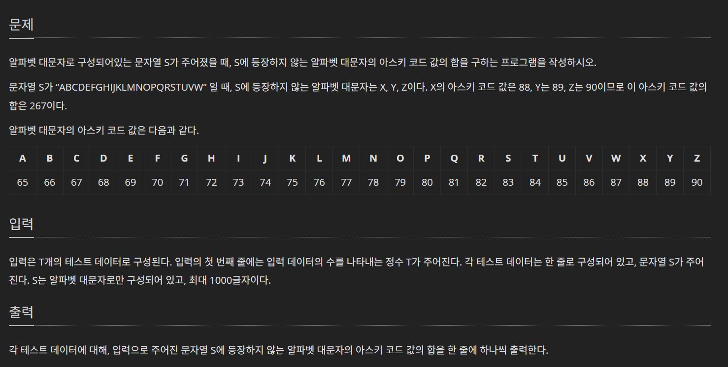 입력한 문자들을 제외한 알파벳들을 찾아야 해서 맨 첫 줄에는 알파벳 대문자 26개를 요소로 갖는 리스트 alphabet을 선언 하였다.