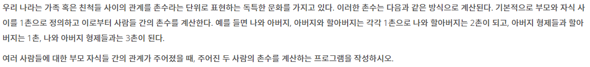 : 입력에서 요구한 두 사람의 촌수를 구하라. 촌수를 계산할 수 없을 때는 -1을 출력하라
