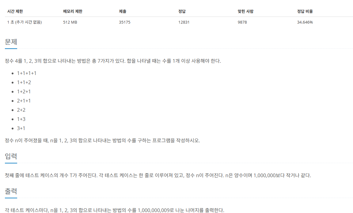 d[n]을 정수 n이 주어졌을 때, n을 1, 2, 3의 합으로 나타내는 방법의 수라고 하면, d[1] = 1 (1), d[2] = 2 (1, 1),(2), d[3] = 4(1, 1, 1), (1, 2), (2, 1), (3)이고 i가 3보다 크다고 했을 때, d[i]는 d[1], d[2], d[3]을 통해서 표현할 수 있다. ex) d[4] = (1, 3), (2, 2), (3, 1) 등