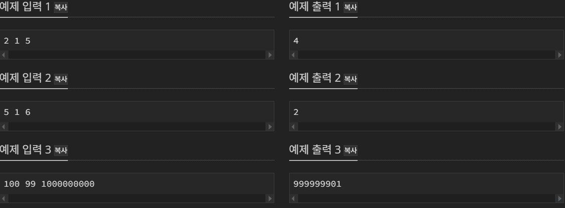 첫째 줄에 세 정수 A, B, V가 공백으로 구분되어서 주어진다. (1 ≤ B < A ≤ V ≤ 1,000,000,000)