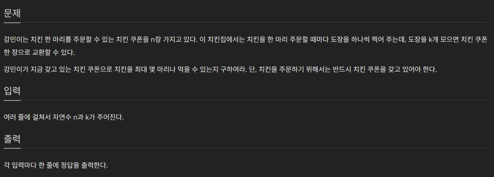 - 쿠폰으로 치킨을 한 마리 시킬 때마다 도장을 1개 받음을 이용해 도장개수를 구하고, 쿠폰 당 필요 도장개수로 나누어 계산한다.