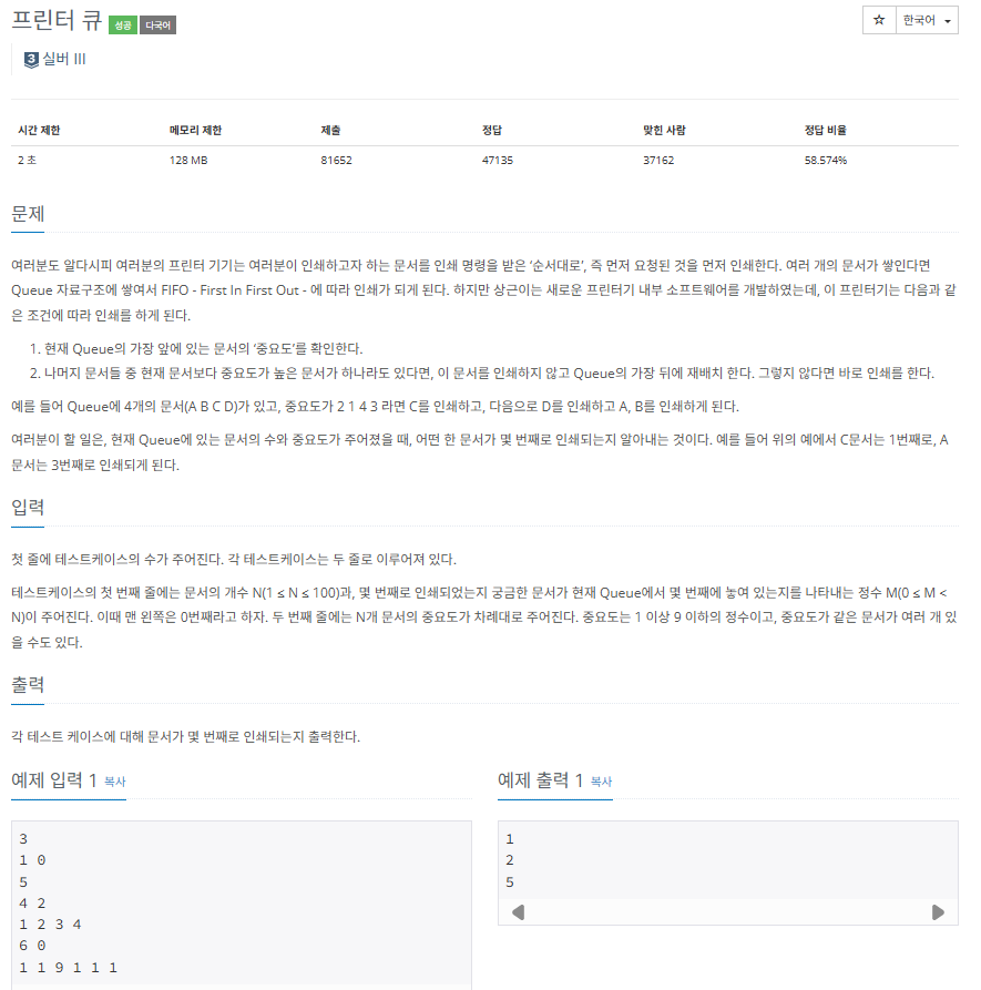 단순히 중요도 순 대로 출력된다고 생각했는데 그럼 틀린다. 우선 같은 중요도일 때도 고려해야하므로 그냥 시키는 대로 코드를 짠다. 테스트 케이스별로 입력받아서 내가 알고 싶은 애를 특정해야하므로 for문을 돌려서 1을 준다. 그리고 전부 나올때까지 반복한다. 맨 앞을 팝하고 플래그 트루로 초기화한다. for문을 지금 있는 개수만큼만 돌려서 지금 팝한애보다 중요한 애가 있으면 플래그 f 로 바꾼다. 만약 플래그 F라면 다시 팝한걸 넣어주고 아니라면 그냥 둔다. 이때 만약 지금 팝한 애가 내가 알고싶던 애면 cnt를 출력한다.