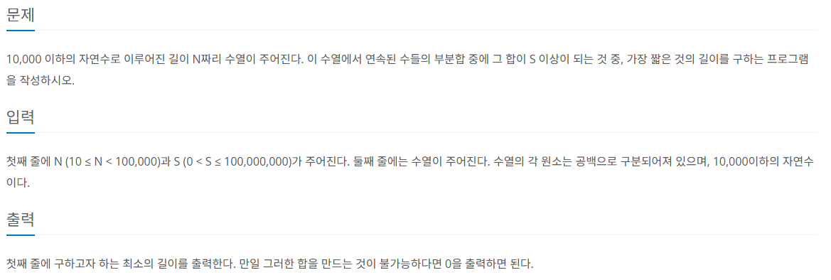- 2 ) sum이 S보다 크다면 result의 값을 업데이트 해주고, 부분합에서 lft위치에 있는 원소를 빼주고 lft 값을 증가
