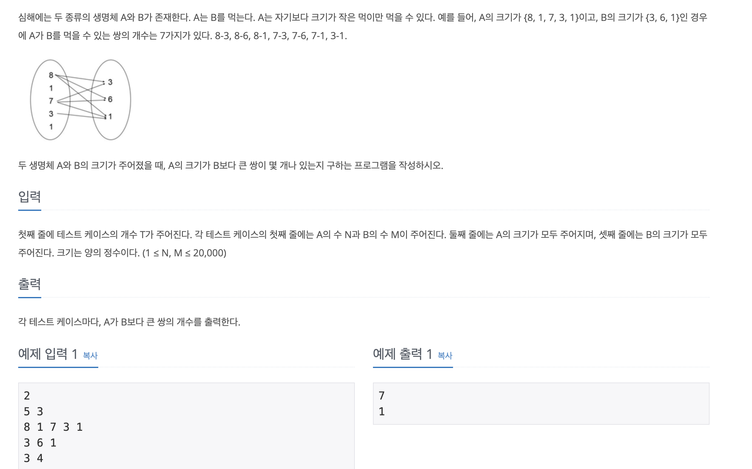 A와 B를 정렬하고 조건에 맞는 (A보다 B가 큰 쌍을) 횟수를 브루트포스로 찾아냈다. N과M이 각각 20000이 최대여서 탐색해야하는 갯수가 그리 크지않아서 가능했다.