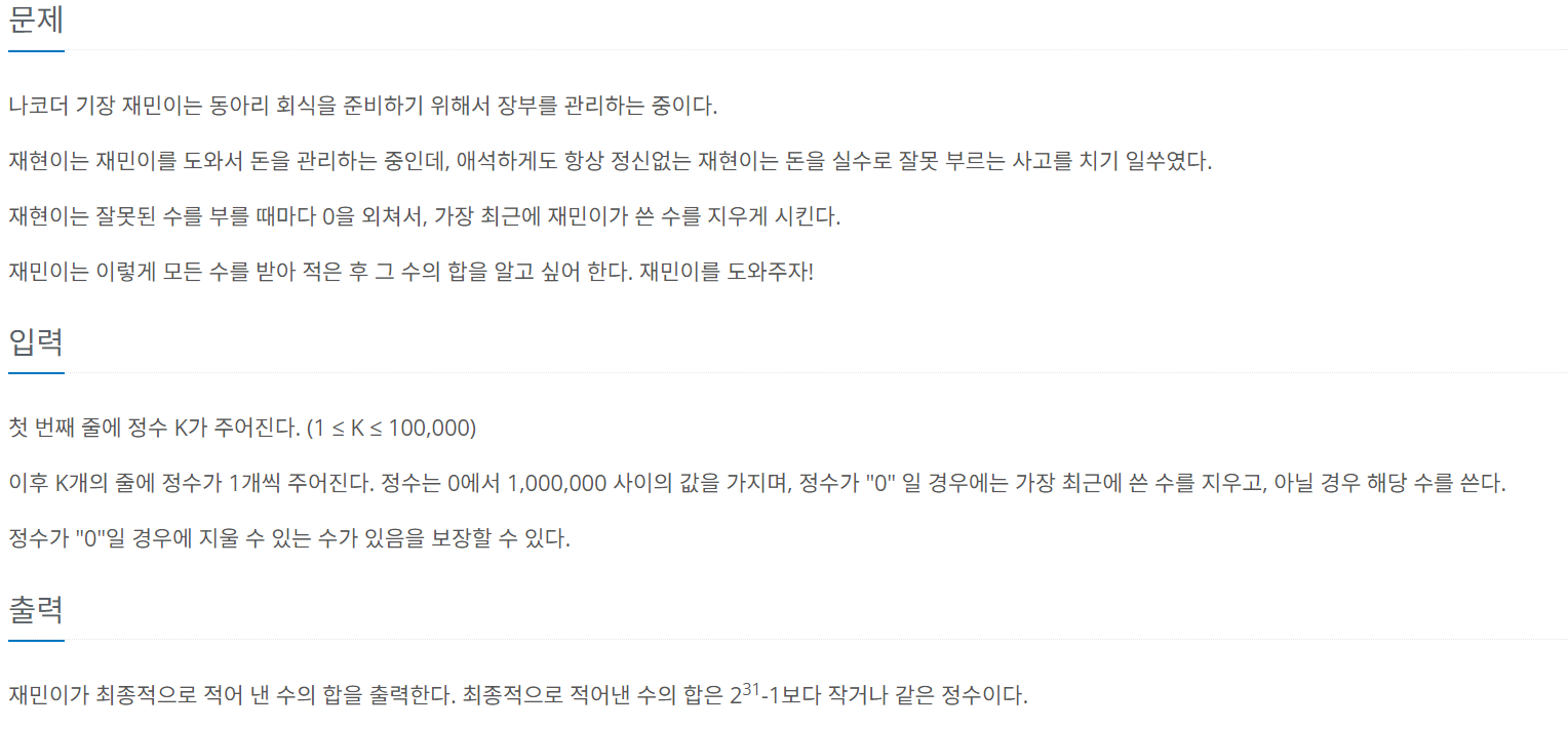 | 단, a에 숫자 0을 입력받을 시엔 스택의 pop연산이 실행되어 마지막에 입력된 a가 삭제됩니다. |