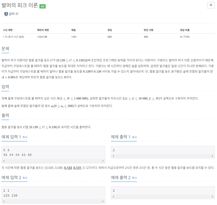 예제 입력 1을 보면 알코올의 지속시간이 3이므로, 첫번째 술은 3시간까지 적용 후 4번째 시간이후부터는 사라지도록 코드를 구성한다.