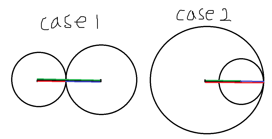 빨간색 선: r1, 파란색 선: r2, 초록색 선: 중심 좌표 간의 거리