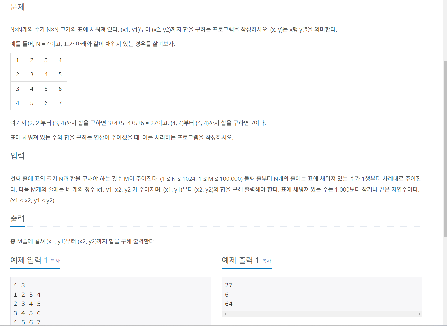2차원 배열 arr은 문제에서 주어진 입력으로 만든 2차원 배열이고 배열 dp는 행별로 누적합을 구한 배열로 설정한다.