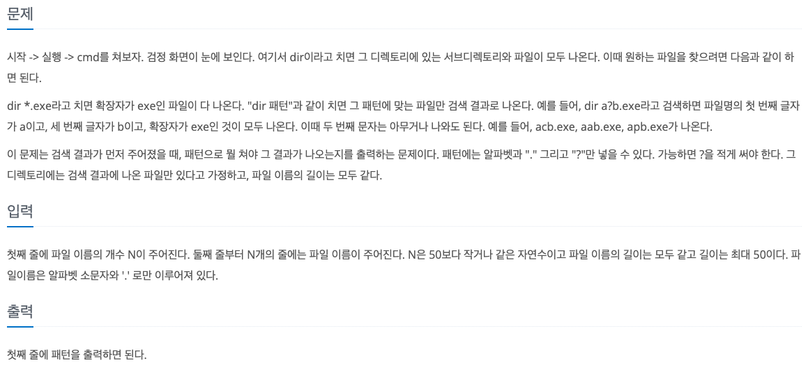 arr 리스트에 파일 이름들을 저장한다. 그리고 각각의 파일이름의 한 글자씩을 서로 비교한다. 만약 하나라도 한 글자가 다르면 "?"를 출력하고 아니면 글자를 출력한다.