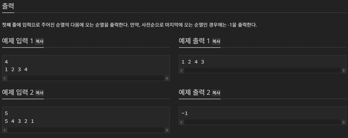 - 다음 순열을 구하기 위해서 바꿔야할 부분은 뒤에서부터 처음으로 내림차순이 아니게 되는 부분까지임을 이용