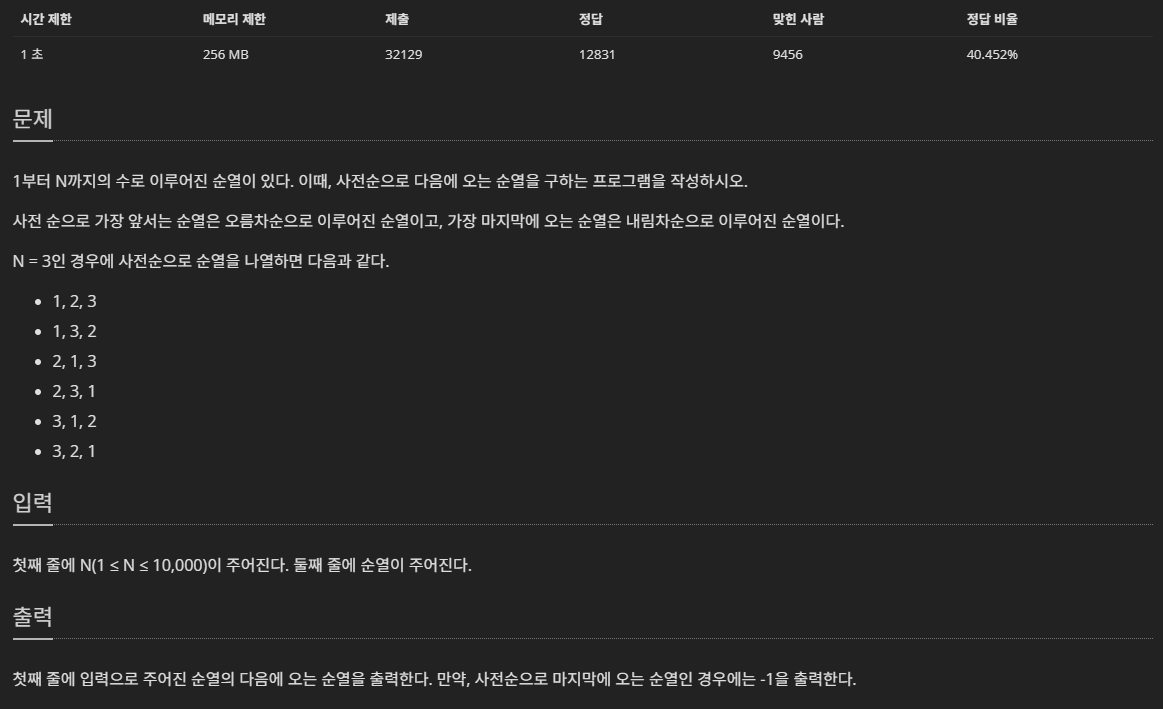 - 다음 순열을 구하기 위해서 바꿔야할 부분은 뒤에서부터 처음으로 내림차순이 아니게 되는 부분까지임을 이용