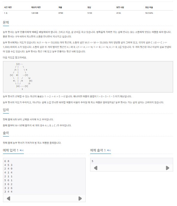 평범하게 다익스트라 함수를 짠다. 헛간 1에서 출발한다. 힙큐를 이용해서 가장 작은 비용을 기록하다보면 dist[n]에 최종 최소비용이 남는다.