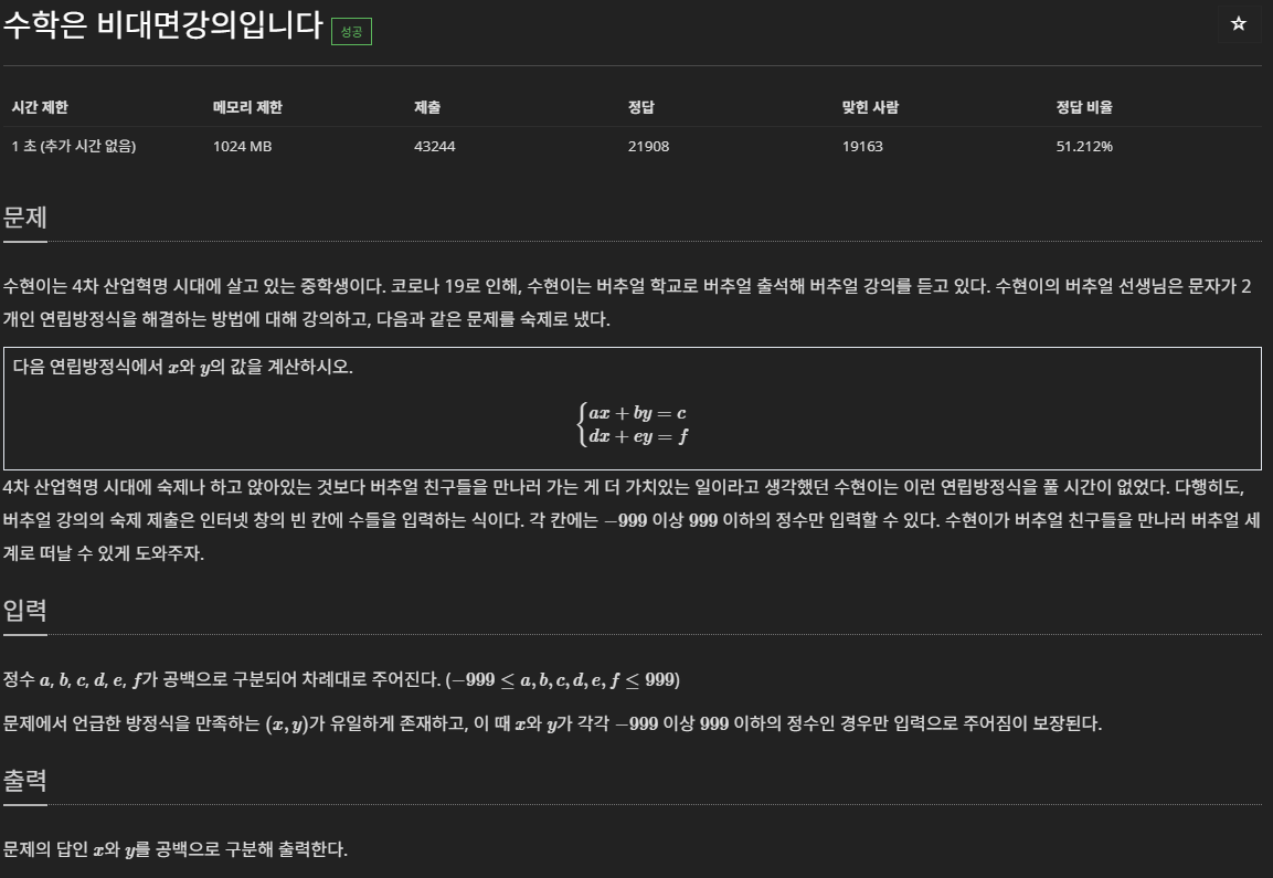 굳이 수학적으로 구하지 않고 제한 시간 내에 가능한 모든 (x, y)를 대입함으로써 해결할 수 있다.