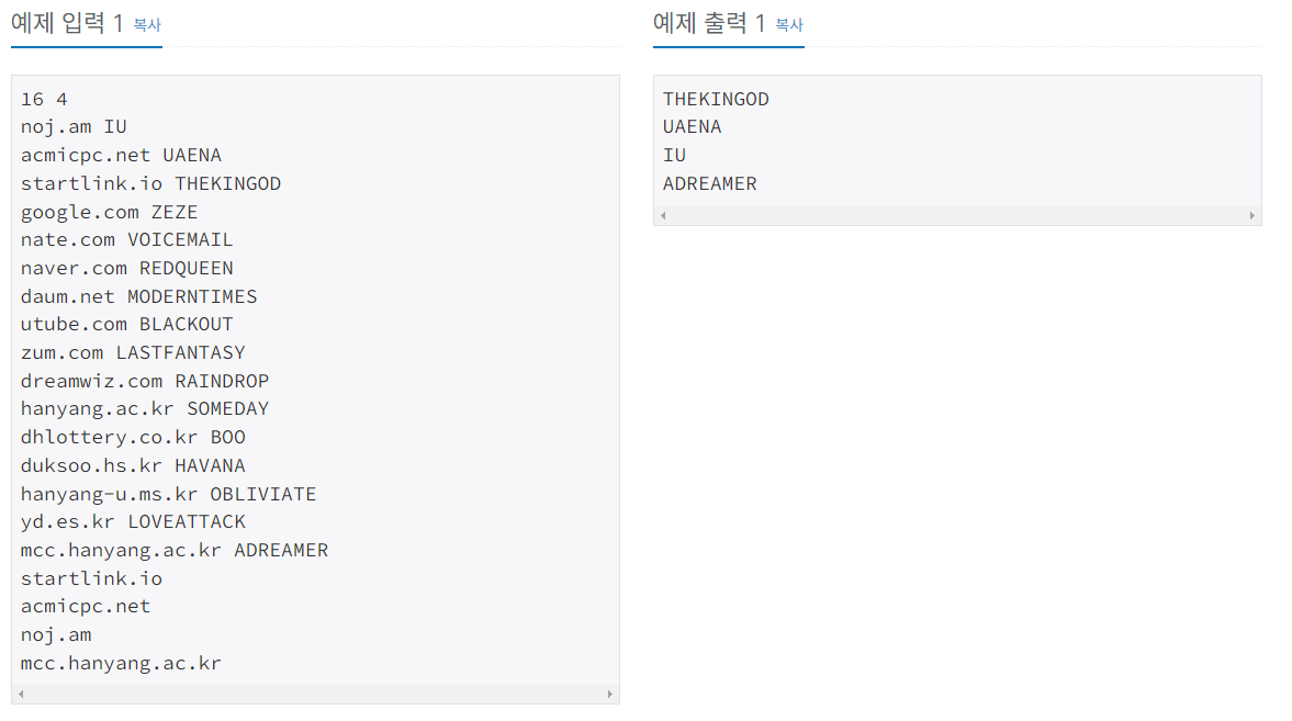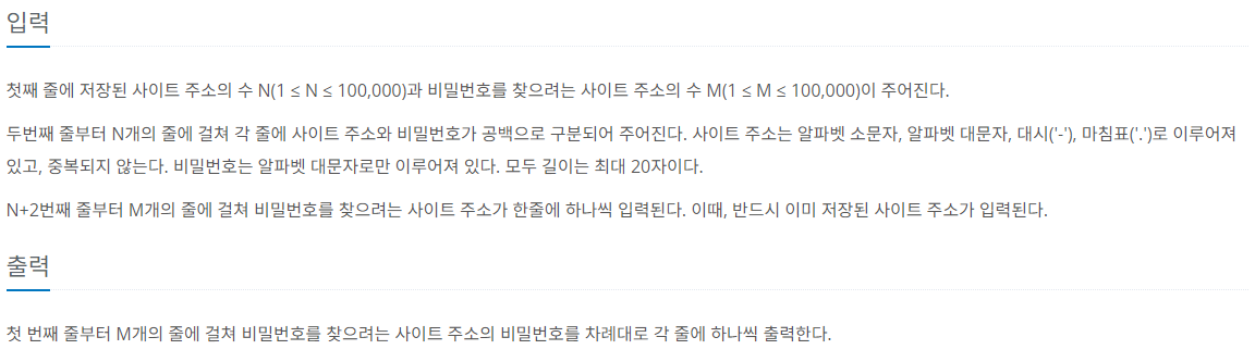 1. 저장된 사이트의 주소 수 N과 비밀번호를 찾으려는 사이트 주소의 수 M을 입력을 받는다.