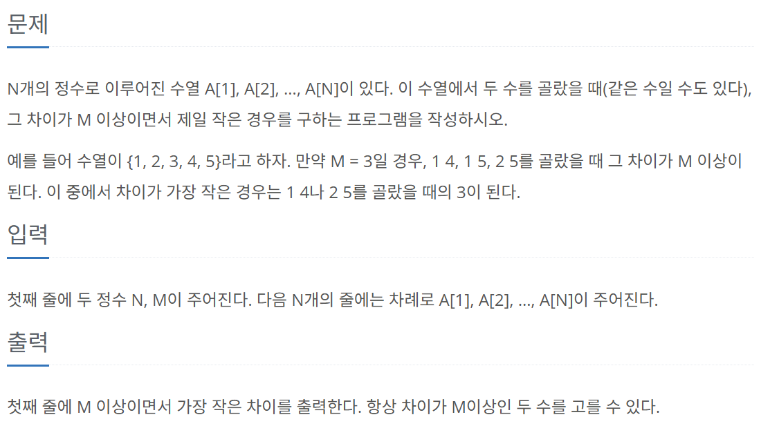 왼쪽에서부터 두 수를 고르고 차이가 M보다 작으면 오른쪽을 한 칸 증가, M보다 크면 왼쪽을 한 칸씩 증가시키면서 더 작은 값이면 갱신을 반복한다.