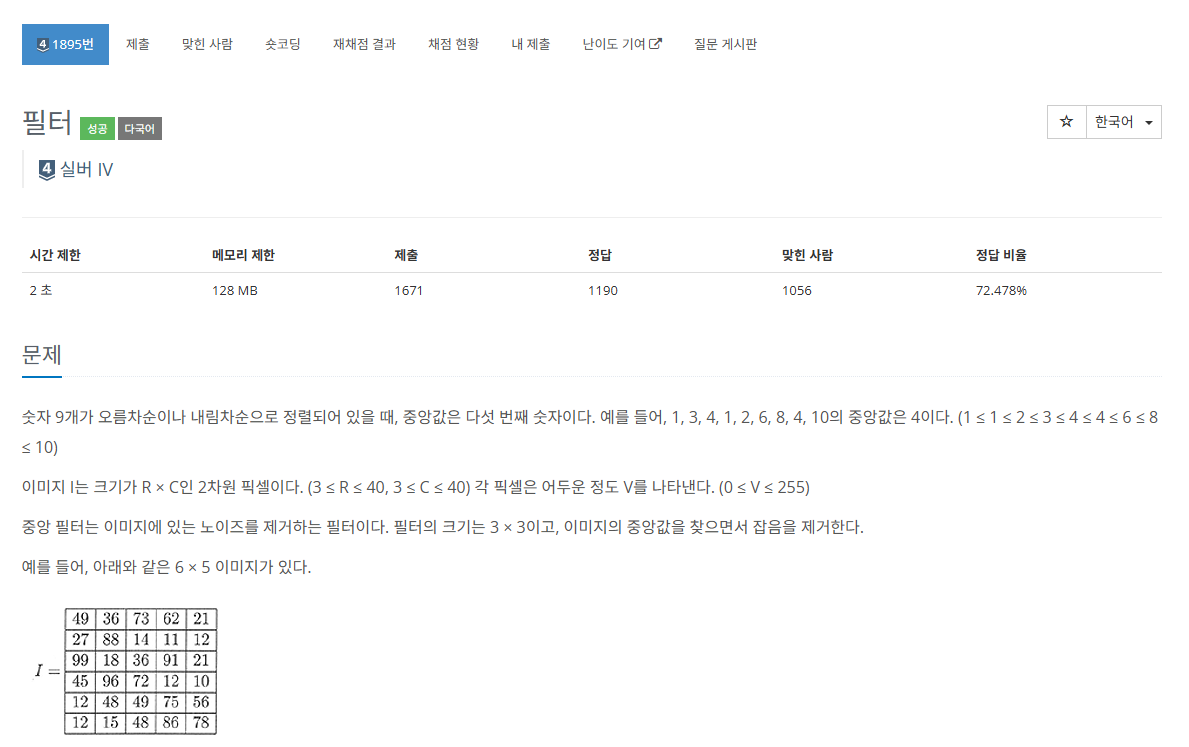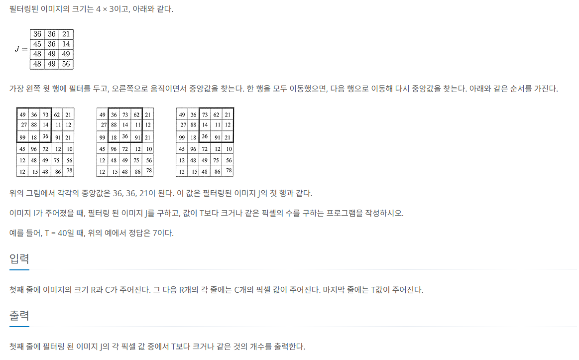 이미지는 R X C의 2차원 픽셀, 필터의 크기는 3 X 3이고 이미지의 중앙값을 통해 판단