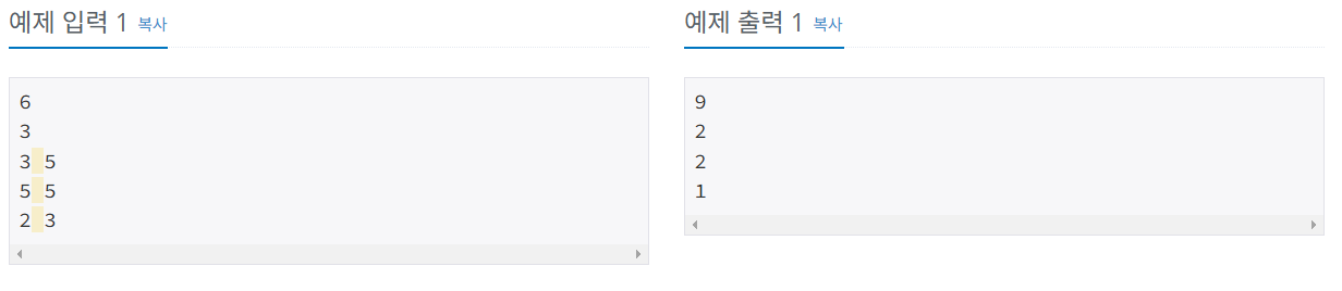 첫째 줄에는 동서방향 도로의 개수를 나타내는 정수 N(5 ≤ N ≤ 1,000)이 주어진다. 둘째 줄에는 처리해야 하는 사건의 개수를 나타내는 정수 W(1 ≤ W ≤ 1,000)가 주어진다. 셋째 줄부터 (W+2)번째 줄까지 사건이 발생된 위치가 한 줄에 하나씩 주어진다. 경찰차들은 이 사건들을 주어진 순서대로 처리해야 한다. 각 위치는 동서방향 도로 번호를 나타내는 정수와 남북방향 도로 번호를 나타내는 정수로 주어지며 두 정수 사이에는 빈칸이 하나 있다. 두 사건이 발생한 위치가 같을 수 있다.