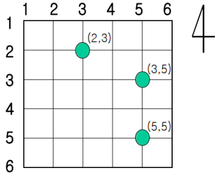 모든 도로에는 도로 번호가 있으며 남북방향 도로는 왼쪽부터 1에서 시작하여 N까지 번호가 할당되어 있고 동서방향 도로는 위부터 1에서 시작하여 N까지 번호가 할당되어 있다. 또한 동서방향 도로 사이의 거리와 남 북방향 도로 사이의 거리는 모두 1이다. 동서방향 도로와 남북방향 도로가 교차하는 교차로의 위치는 두 도로의 번호의 쌍인 (동서방향 도로 번호, 남북방향 도로 번호)로 나타낸다. N이 6인 경우의 예를 들면 다음과 같다.
