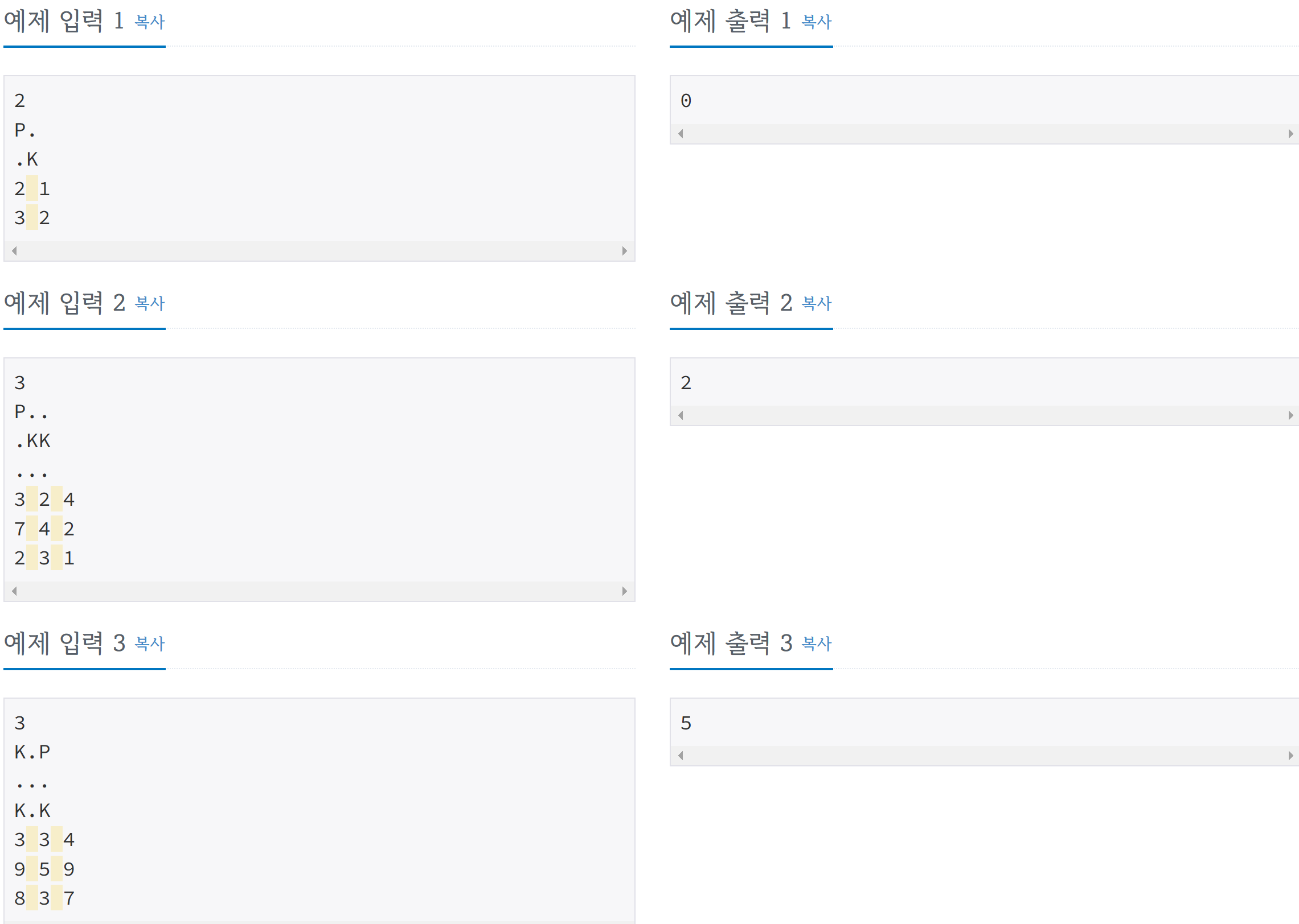 상덕이는 언덕 위에 있는 마을의 우체국에 직업을 얻었다. 마을은 N×N 행렬로 나타낼 수 있다. 행렬로 나뉘어진 각 지역은 우체국은 'P', 집은 'K', 목초지는 '.' 중 하나로 나타낼 수 있다. 또, 각 지역의 고도도 알고 있다.