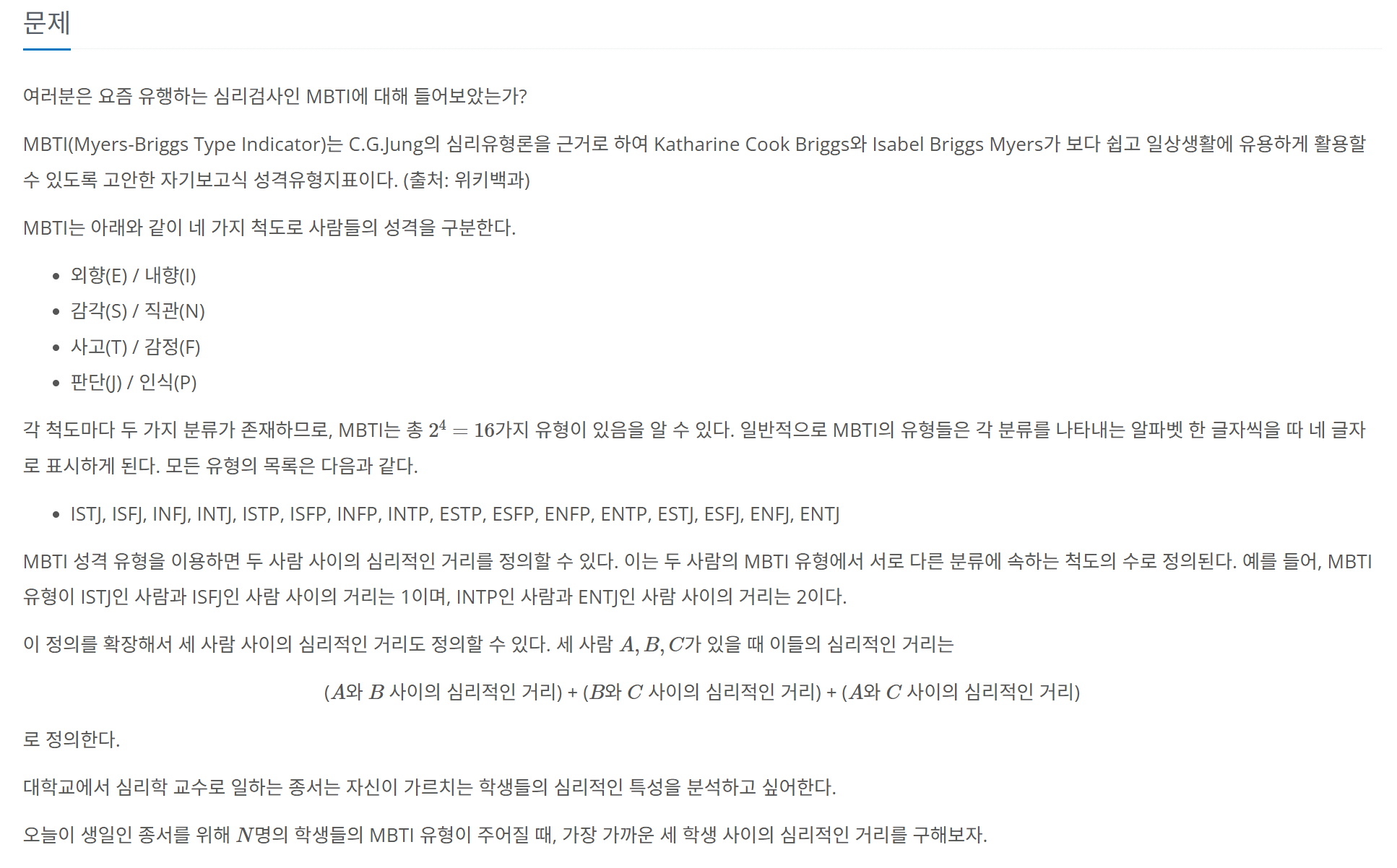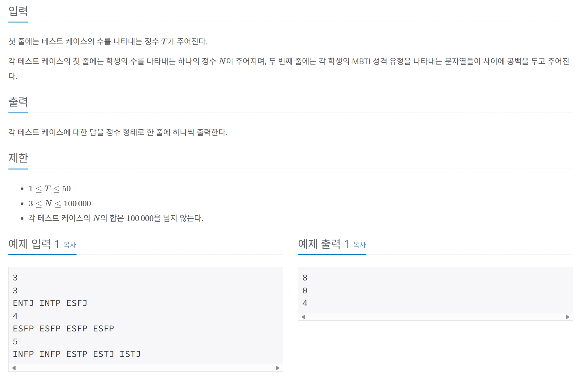 2. MBTI의 개수는 16개이기에 비둘기집 정리에 의해 N이 33개 이상이면 무조건 같은 MBTI 3개가 나온다. 따라서 N이 33개 이상일 때는 답을 0으로 출력해준다.