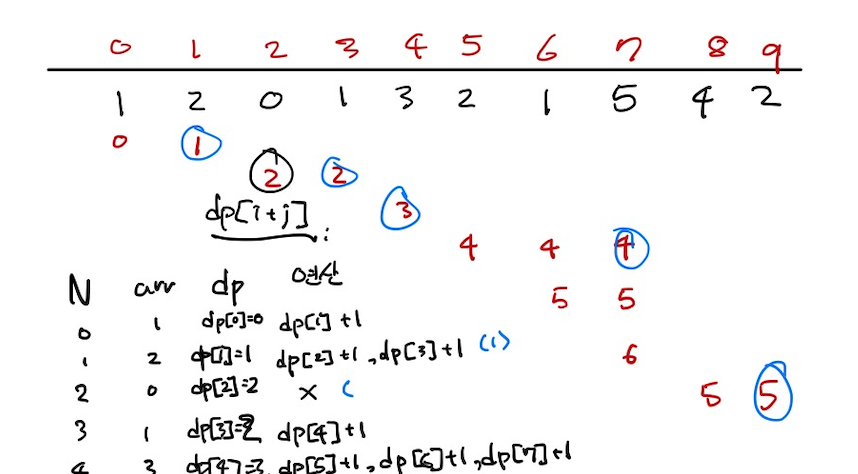 Ex. dp[5] = 3 : 5번 영역에 도달하기까지 3번 점프했다!