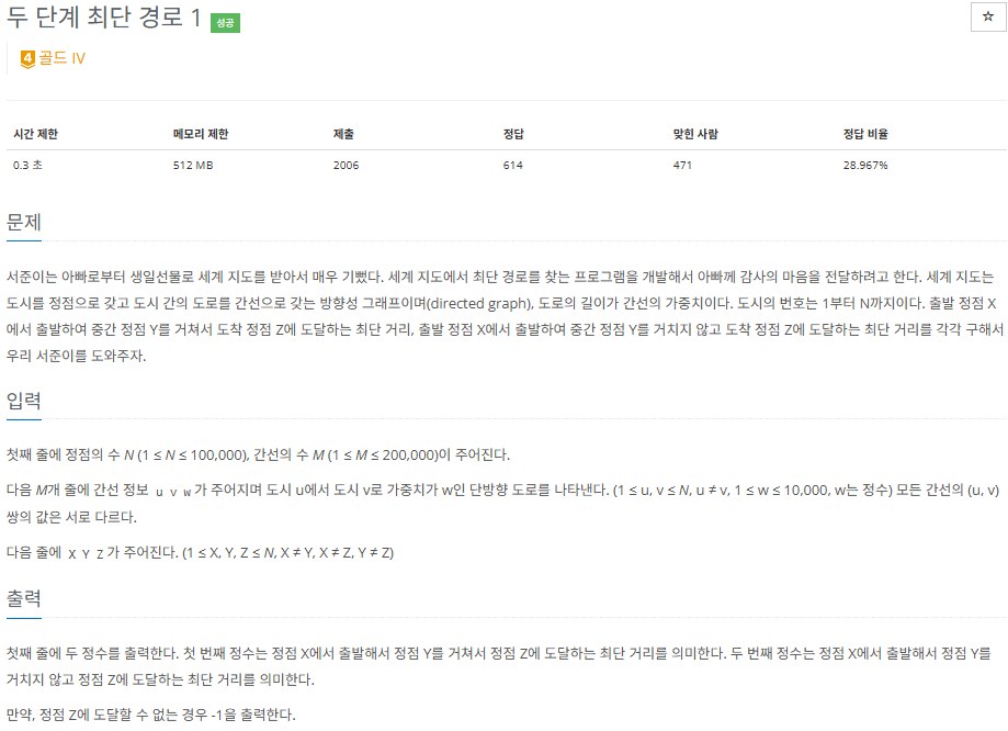 다익스트라를 활용하여 Y노드를 포함해서 Z까지의 최단경로와, Y노드를 지나지 않고 Z까지의 최단경로를 구하는 문제이다.