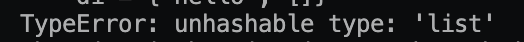 mapWithStringAndList1 = {"key", []} # error : unhashable type: 'list'