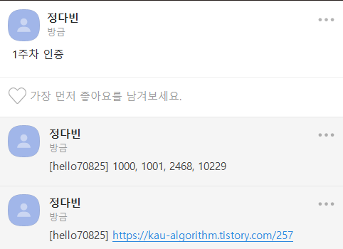 - 인증 방법은 카카오톡 게시판에 댓글로 "[백준 아이디] 팀블로그에 포스팅한 링크"로 댓글을 달아주시면 됩니다.