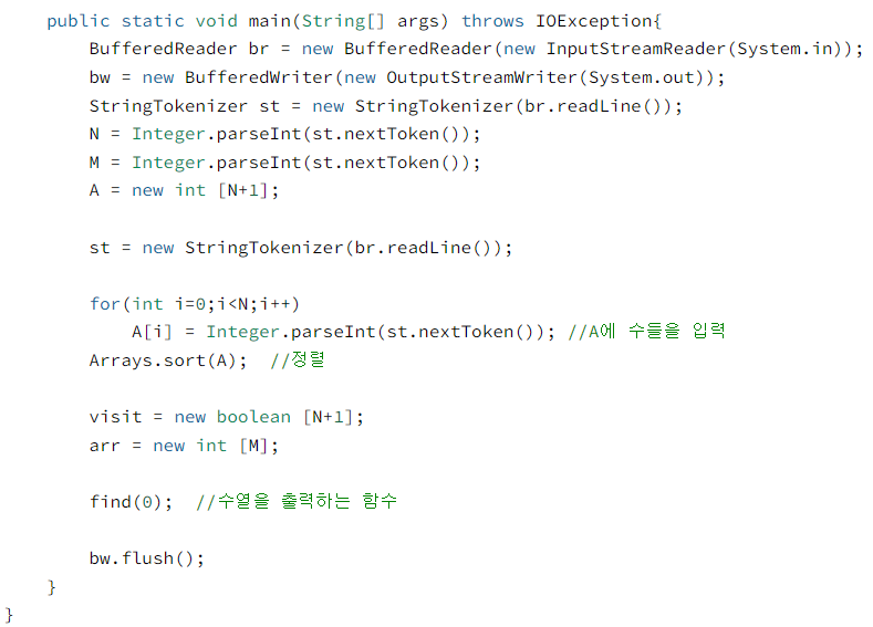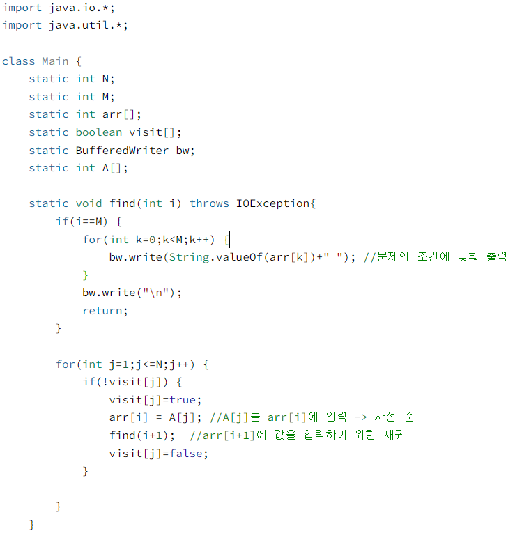 입력받은 수를 사전 순으로 출력하는 것이 문제의 조건이다. 수 들이 임의의 순서로 주어지므로 이를 정렬하고, 완전 탐색을 이용한다.