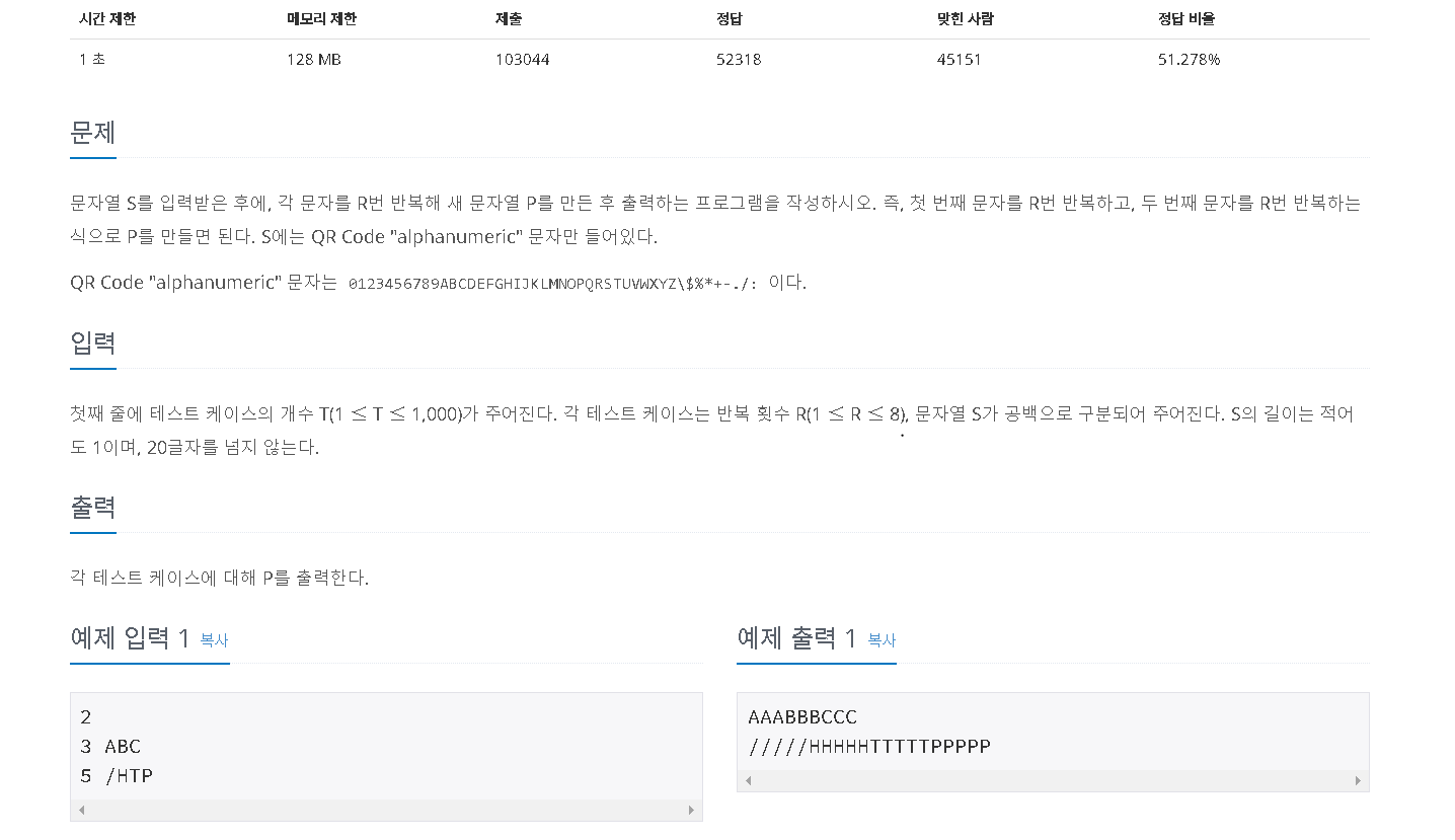 문제를 요약 하자면 처음으로 반복할 문자열 개수(2개) 가 주어지고, 그다음 부터 각각 반복할 문자열 개수(3,5)와 해당 문자열(ABC, /HTP)가 주어지는 것 같다.