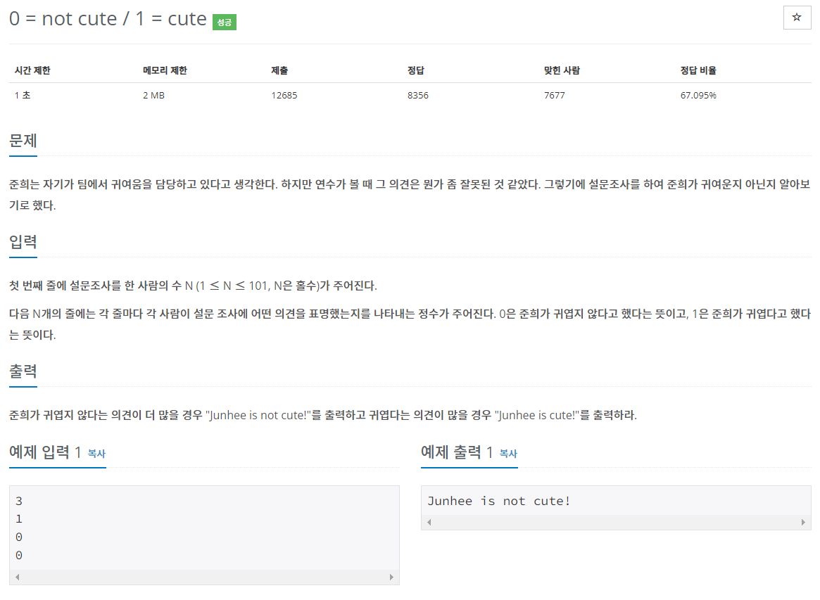 설문조사를 한 사람의 수를 입력받아 변수 n에 저장한 후, 설문조사에 1로 응답한 사람의 수를 cnt라 하고 0으로 초기화한다. 0 또는 1을 입력받고, 1을 입력받은 경우에 cnt에 1을 더해 주는 과정을 n번 반복한다. 모든 과정이 끝난 후, n이 홀수이므로 cnt가 n을 2로 나눈 몫보다 클 경우에 'Junhee is cute!'를 출력하고, 그렇지 않으면 'Junhee is not cute!'를 출력한다.