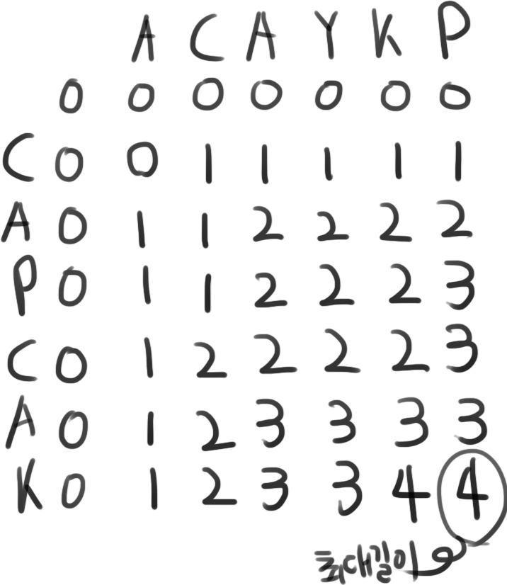 최대 문자열 길이 구하기는 기존 LCS문제와 동일