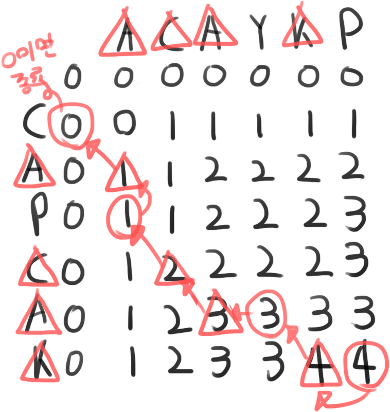 if a[i] == b[j] 이면 리스트에 a[i]를 담고, dp[i-1][j-1]으로 이동