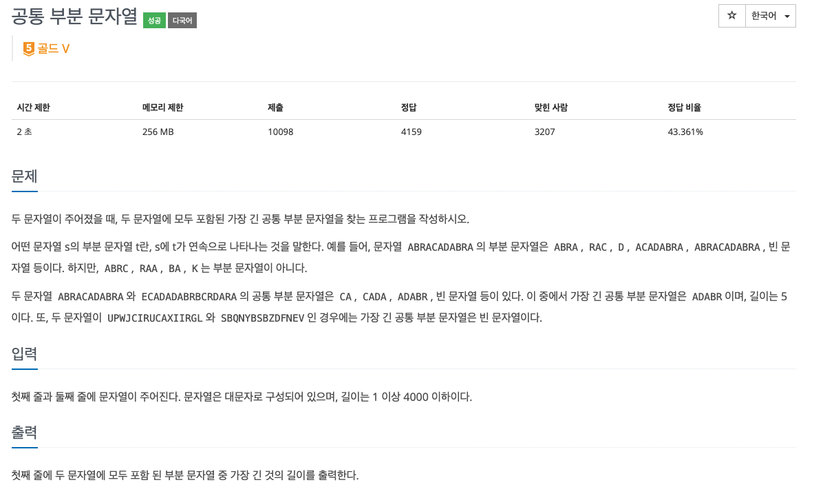오늘은 백준 알고리즘 5582번 공통 부분 문자열문제를 풀어보는 시간을 가져보겠습니다.