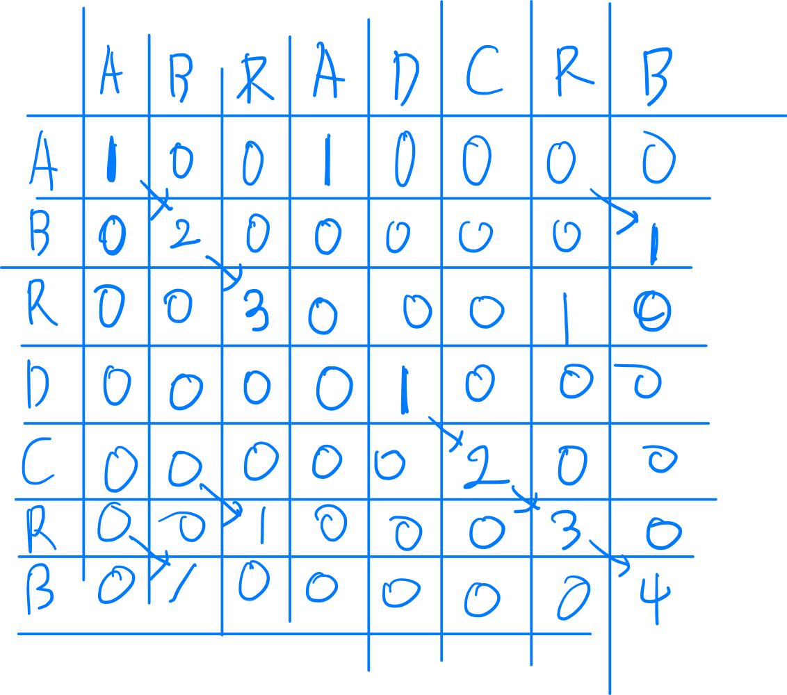 위의 그림처럼 문자열 두 개의 문자가 같을 때 이전에 같았던 dp[i-1][j-1] + 1 임을 파악할 수 있고