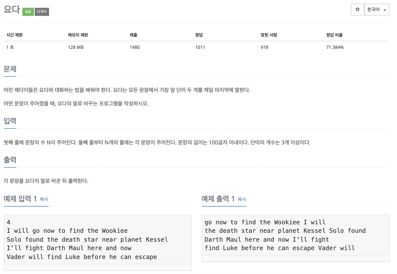 join 과 indexing 을 활용하여 깔끔하게 한줄로 리스트를 문자열로 구성했다. 먼저 문장의 개수를 입력받고 문장을 받을 때마다 split 하여 단어단위로 저장했다. 이를 join 을 사용해서 뒤의 “두번째 단어 부터 마지막 단어까지”, “앞에서 두개의 단어” 로 각각의 문자열로 바꿔준 뒤에 합쳐서 출력했다.