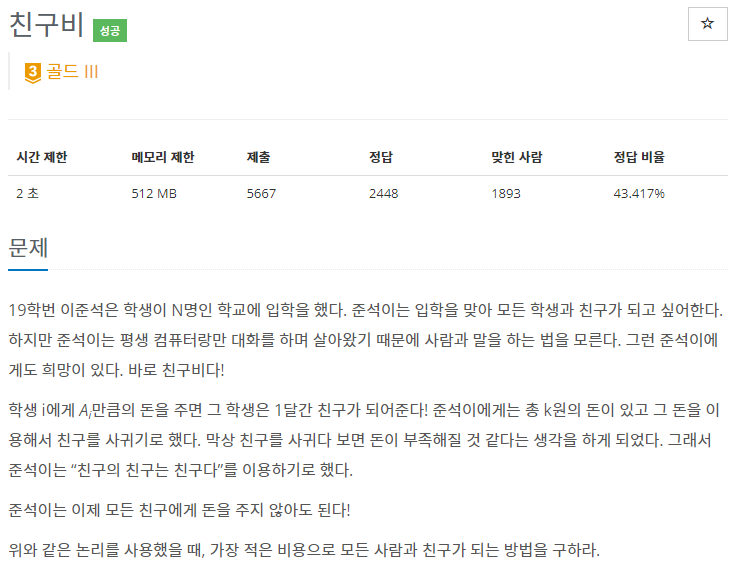 두번째 줄 부터 학생 N의 학생이 원하는 친구비 An 이 주어진다.