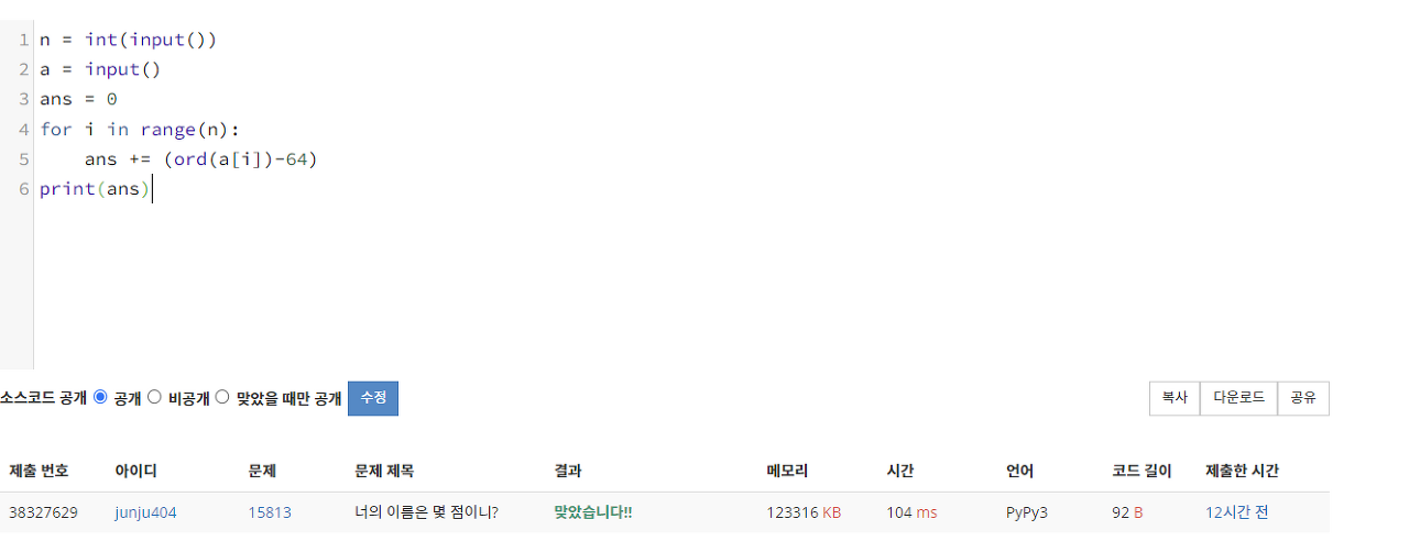 하지만 여기서 주의할 점은, 알파벳의 진수화와 문제에서 요구하는 순서와는 다르다. 'A'의 경우 진수로 표현하면(ord) 65이지만, 문제에서는 첫 번째 알파벳이므로 1로 취급한다. 그렇기 때문에 모든 문자의 진수화에서 64의 값을 뺀 값만큼 모두 더 해준다면 문제에서 요구하는 모든 문자의 합을 구할 수 있다.