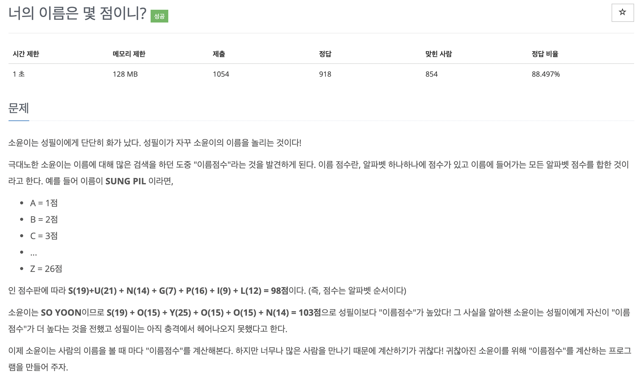15813번: 너의 이름은 몇 점이니?
