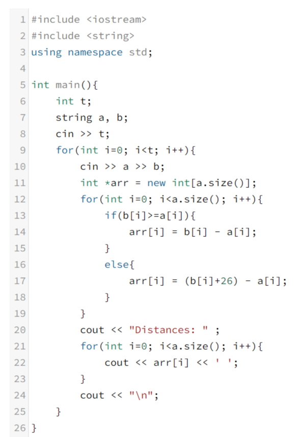 각 테스트 케이스 마다 각 글자의 알파벳 거리를 공백으로 구분해 출력한다.