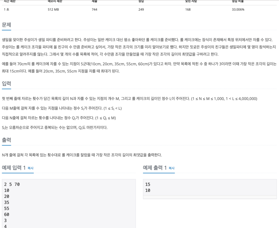 오늘은 백준 알고리즘 17179번 케이크 자르기 문제를 풀어보도록 하겠습니다.