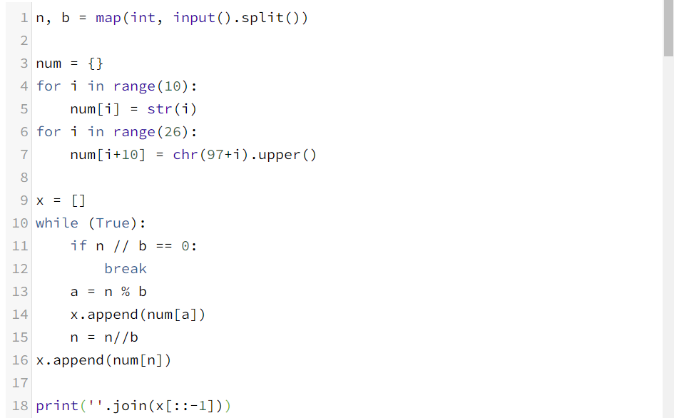 10진법에서 다른 진법으로 바뀔 숫자(n)과 다른 진법(b)를 입력받는다. 그리고 하나의 딕셔너리에 각 진법에 해당하는 숫자 혹은 알파벳로 초기화시킨다. 왜냐하면 10진법에서 다른 진법으로 표현하기 위해서는 해당 값의 나머지를 필요로 하는데, 이 나머지가 해당하는 숫자가 바로 딕셔너리에 존재하는 key가 되기 때문이다. 그리고 key에 해당하는 숫자 혹은 알파벳을 value에 초기화되어 있다.