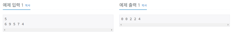 예를 들어 높이가 6, 9, 5, 7, 4인 다섯 개의 탑이 수평 직선에 일렬로 서있다고 하자. 그러면, 높이가 4인 다섯번째 탑에서 발사한 레이저 신호는 높이가 7인 네 번째 탑이 수신을 하고, 높이가 7인 네 번째 탑의 신호는 높이가 5인 탑을 지나쳐 높이가 9인 탑이 수신을 한다.