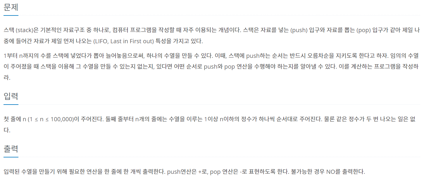 첫째 줄에서는 n을 입력받고, 두번째 줄에서 네번째 줄까지는 arr이라는 배열을 생성하여 수열의 숫자를 입력해 저장하도록 한다. stack이라는 배열은 스택으로 사용하고 result라는 배열에는 +,-등의 값을 저장하도록 하며, idx 초기값은 0으로 설정한다. 반복문을 사용하여 숫자 i를 1부터 n까지 순차적으로 올리도록 하는데, append로 result와 stack에 각각 +와 숫자 i를 넣도록 한다. 여기서 arr배열의 idx위치에 있는 값과 i의 값이 같다면 result에 -를 넣고 pop를 사용하여 stack에서는 i값을 빼낸 뒤, idx의 값을 하나 증가시킨다. 그 뒤 while문을 사용하여 stack의 마지막 값과 arr배열의 idx위치에 있는 값이 다르다면 break문으로 while문을 빠져나오고, 같다면 위와 마찬가지로 result에 -를 넣고 pop로 stack에서의 i값을 빼낸 뒤 idx를 하나 증가시키는 방식을 반복한다. for 반복문이 모두 끝난 뒤 stack에 값이 남아있다면 NO를 출력시키고, 값이 남아있지 않다면 result값을 하나씩 출력시킨다. 이를 코드로 구현한 것은 아래와 같다.