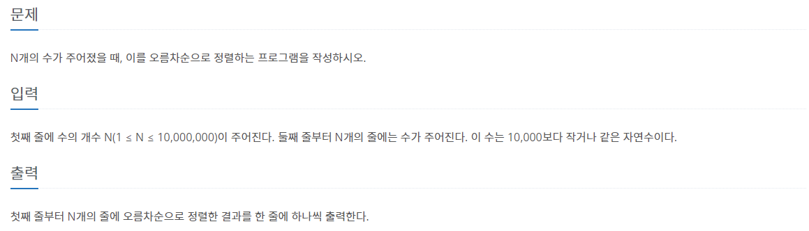 https://www.acmicpc.net/problem/10989 10989번: 수 정렬하기 3 첫째 줄에 수의 개수 N(1 ≤ N ≤ 10,000,000)이 주어진다. 둘째 줄부터 N개의 줄에는 수가 주어진다. 이 수는 10,000보다 작거나 같은 자연수이..
