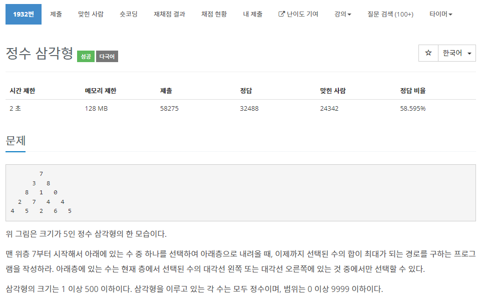첫째 줄에 삼각형의 크기 n(1 ≤ n ≤ 500)이 주어지고, 둘째 줄부터 n+1번째 줄까지 정수 삼각형이 주어진다.